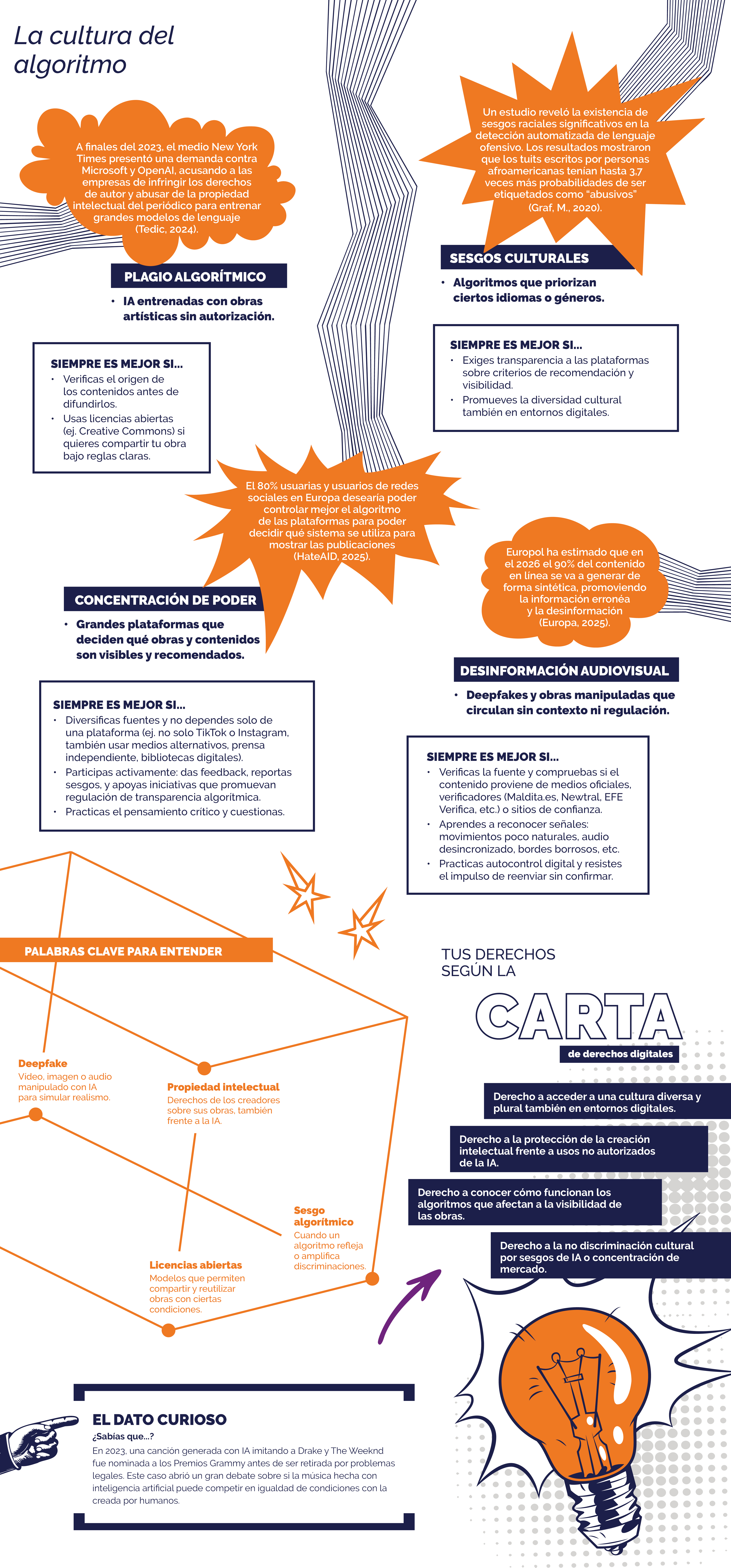 En este nuevo ecosistema cultural, la tecnología y la creatividad se cruzan constantemente. Surgen temas como el plagio algorítmico, los sesgos culturales, la desinformación audiovisual o la concentración de poder en pocas plataformas. Entender estos retos no solo nos ayuda a consumir cultura de forma más consciente, sino también a defender nuestros derechos como creadores, usuarios y ciudadanos digitales en un mundo donde lo real y lo artificial ya se mezclan cada vez más.